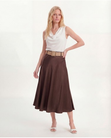 Gonna midi effetto raso. Vita elasticizzata sulla parte posteriore. Dettaglio di cintura inclusa. Tasche laterali.