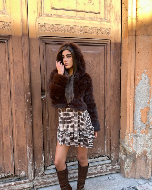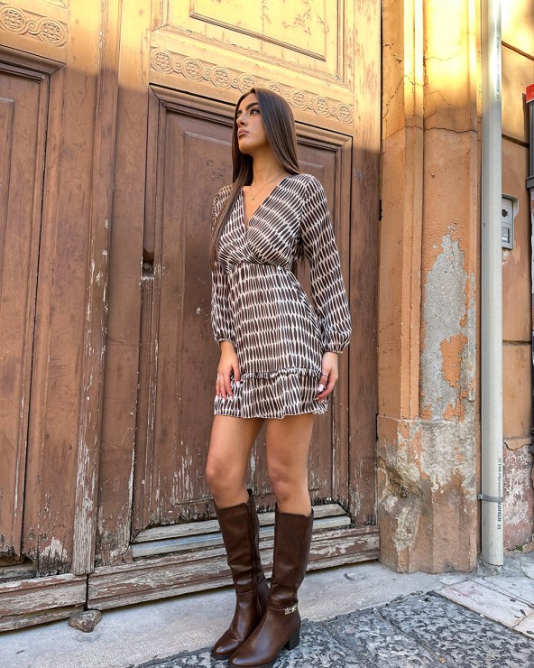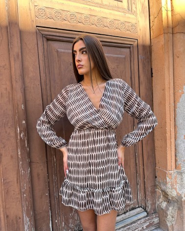 Vestito mini con fantasia geometrica. Scollo a v incrociato e maniche lunghe con polsino elasticizzato. Orlo con volant. Vita elasticizzata.