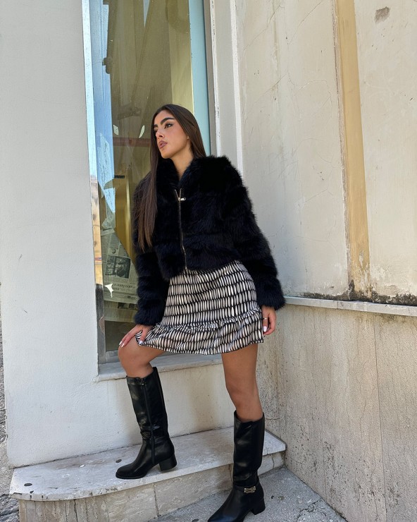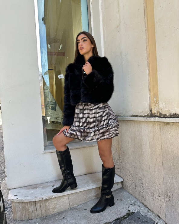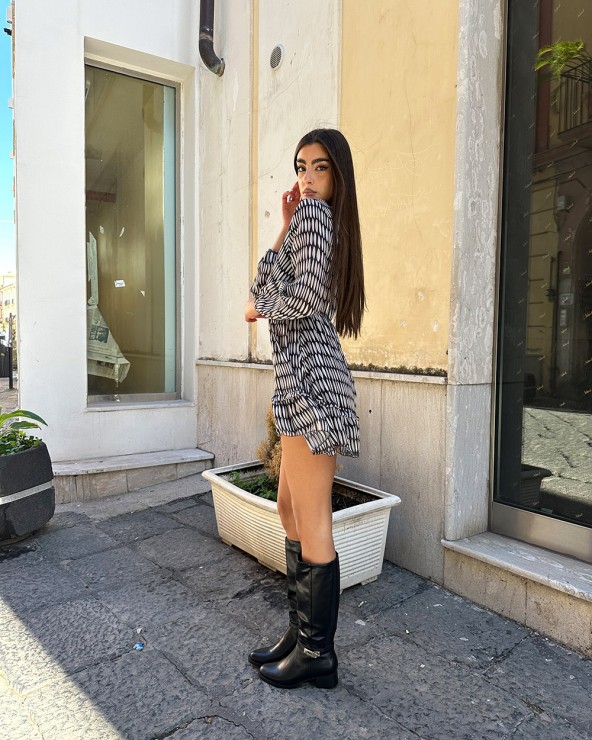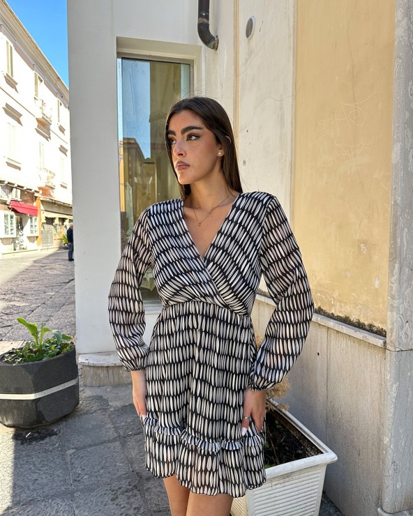 Vestito mini con fantasia geometrica. Scollo a v incrociato e maniche lunghe con polsino elasticizzato. Orlo con volant. Vita elasticizzata.