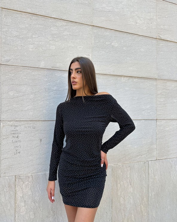Vestito mini elasticizzato con scollo morbido e maniche lunghe. Dettaglio di strass e arricciature.