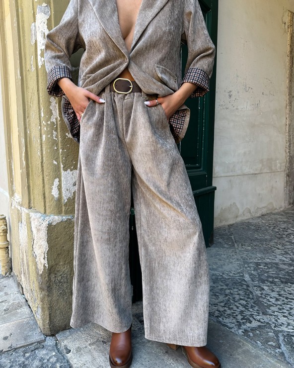 Pantaloni a palazzo in velluto. Vita elasticizzata. Tasche laterali. Dettaglio di cintura in ecopelle inclusa.