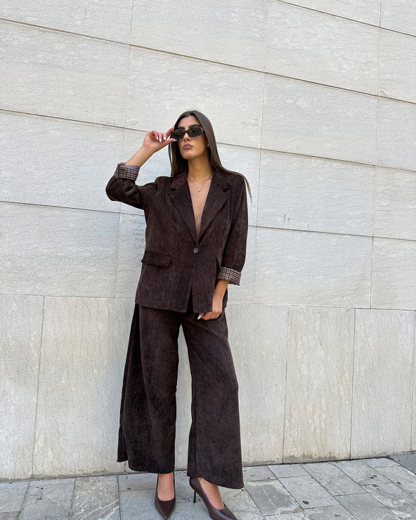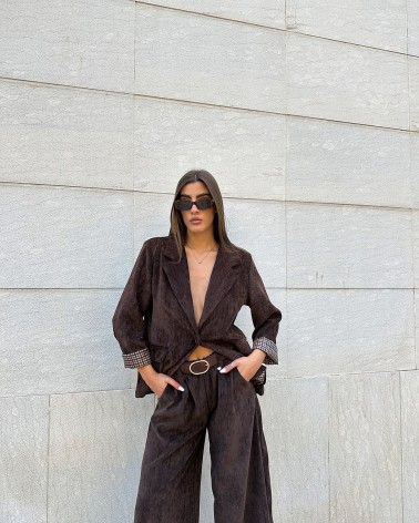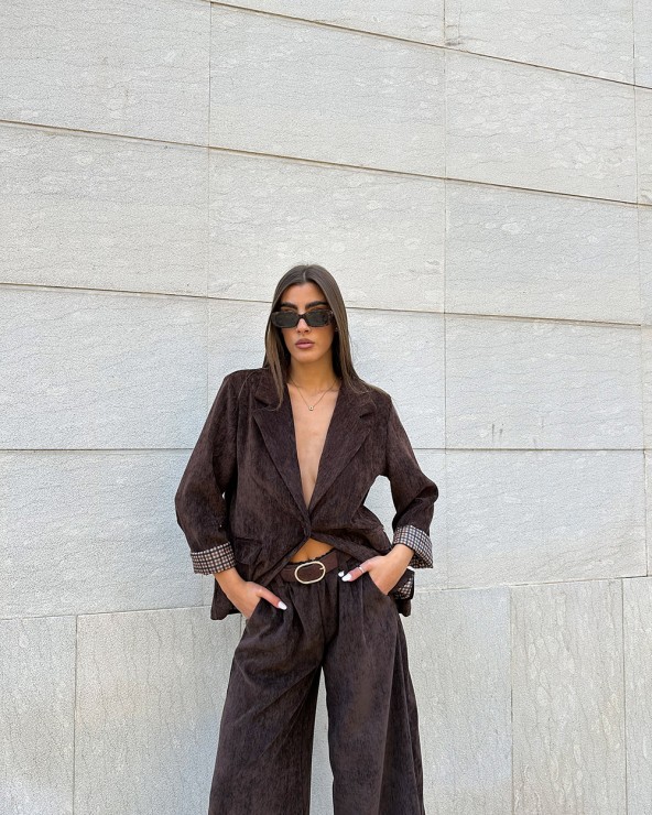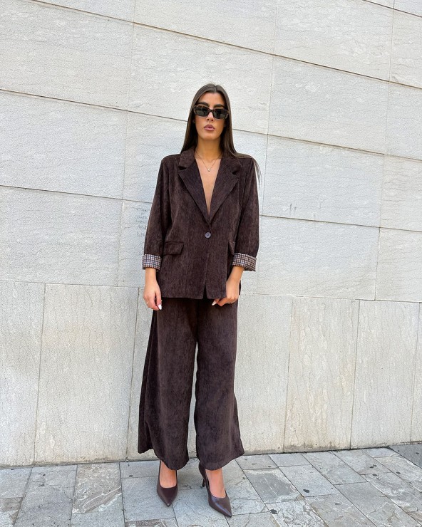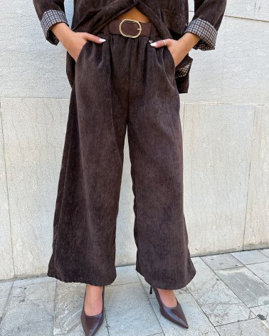 Pantaloni a palazzo in velluto. Vita elasticizzata. Tasche laterali. Dettaglio di cintura in ecopelle inclusa.