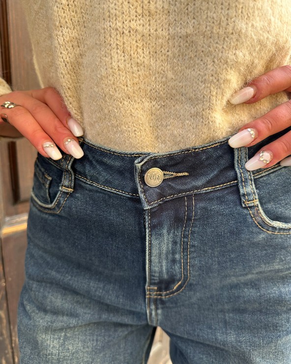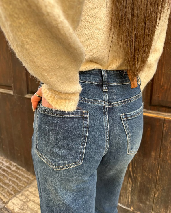 Jeans a palazzo. Vita alta con cinque tasche. Chiusura frontale con bottone e cerniera metallica.