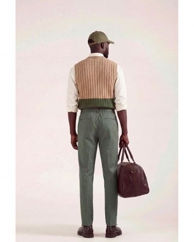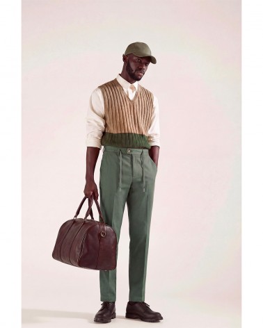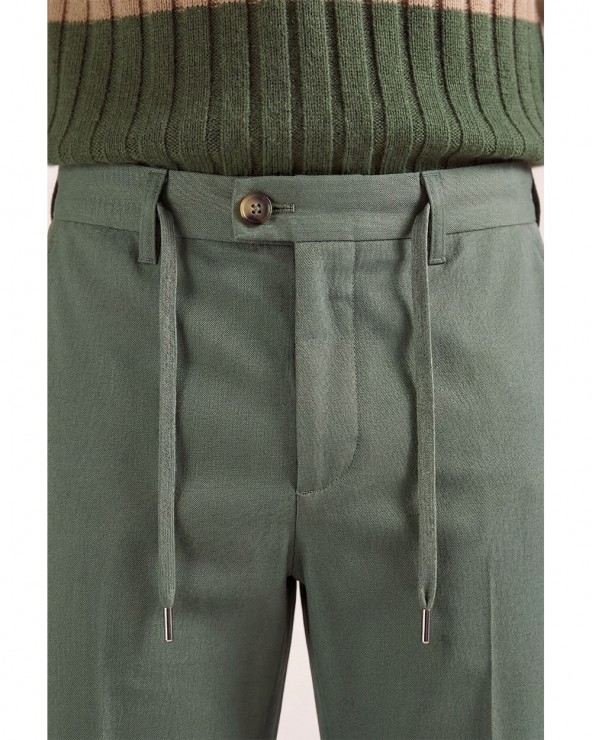 Pantalaccio in cotone con tasche a filetto anteriori e posteriori. Chiusura frontale con cerniera e doppio bottone. Vita elasticizzata nella parte posteriore regolabile con lacci.