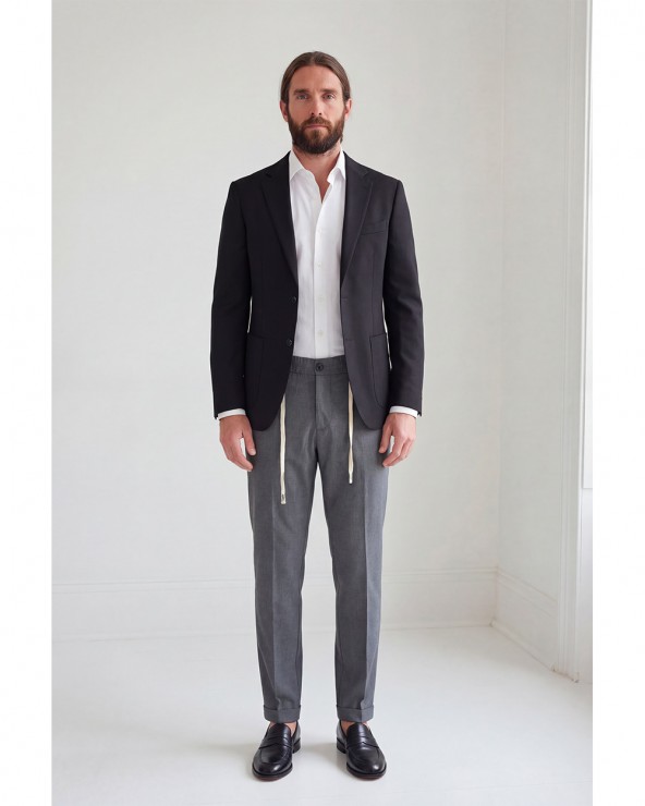 Pantalaccio con tasche a filetto anteriori e posteriori. Chiusura frontale con cerniera e bottone. Vita elasticizzata nella parte posteriore regolabile con lacci. Dettaglio di orlo con risvolto.