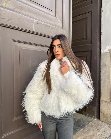 Ecopelliccia con colletto a revers. Chiusura frontale con ganci. Tasche laterali. Presenta fodera interna. Effetto lurex.