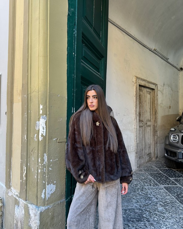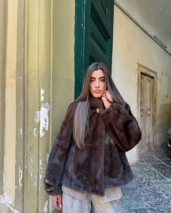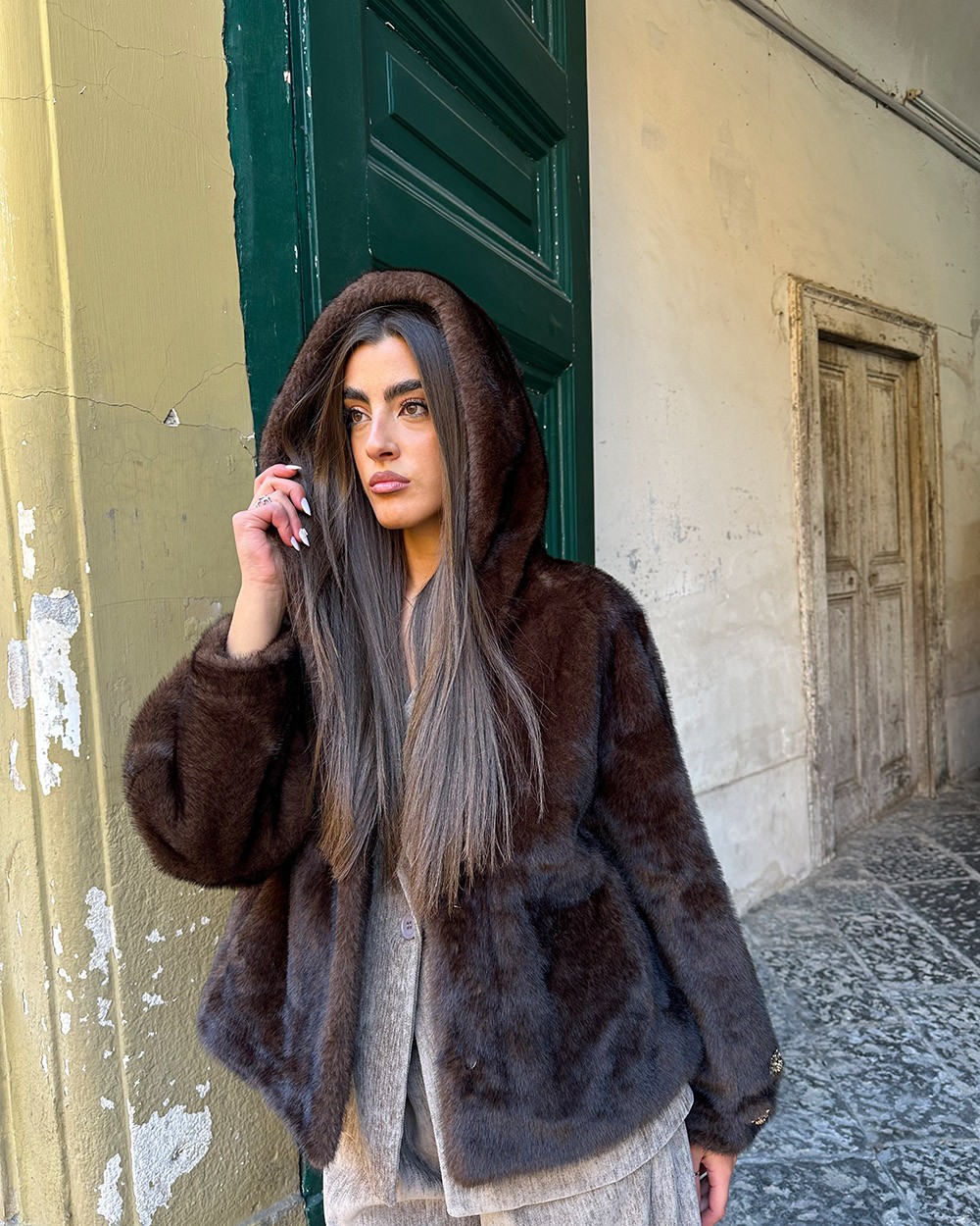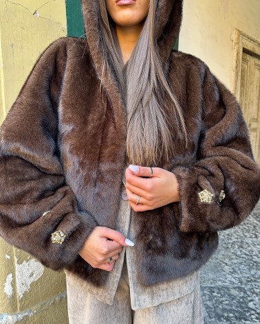 Ecopelliccia con cappuccio. Chiusura frontale con ganci. Tasche laterali. Dettaglio di arricciature e finti bottoni gioiello.