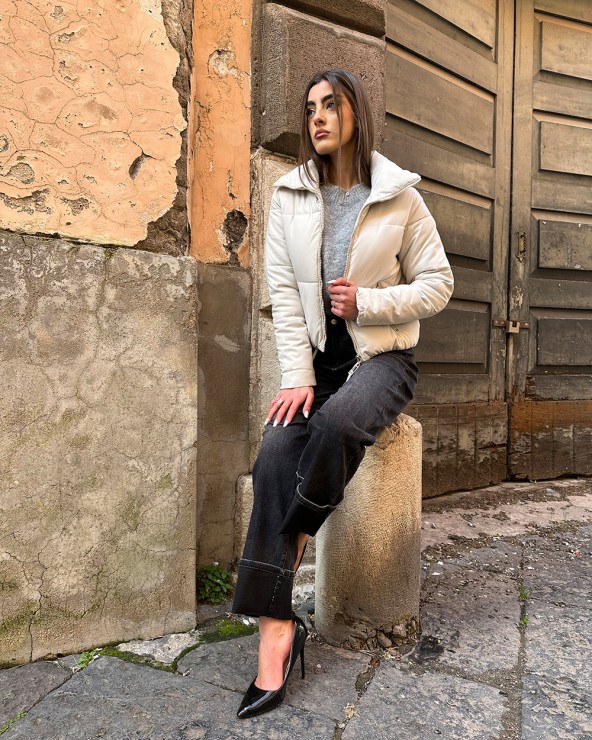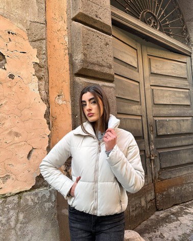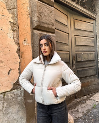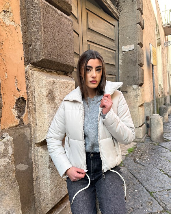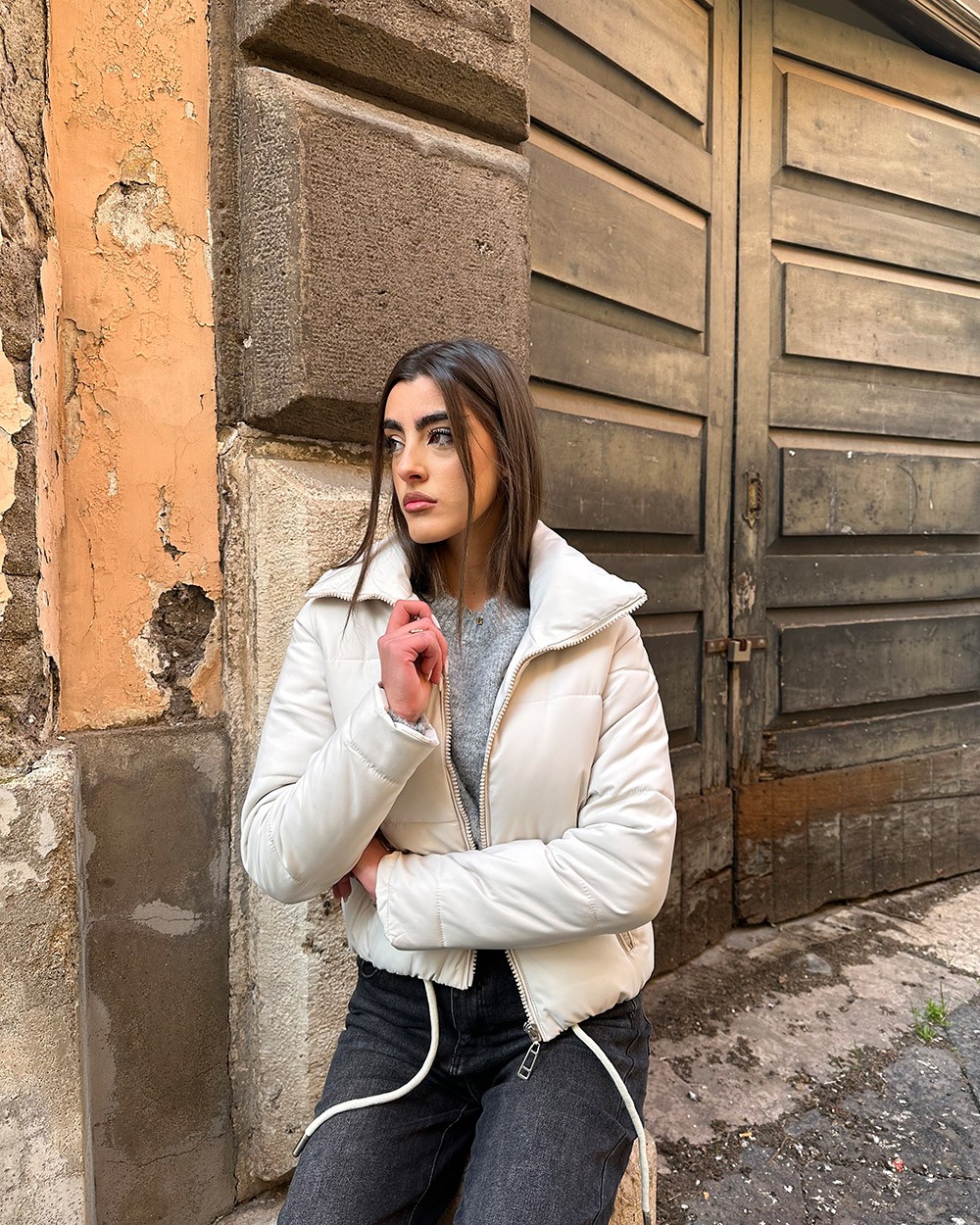 Bomber cropped. Chiusura frontale con cerniera. Tasche anteriori con cerniera. Orlo inferiore elasticizzato regolabile con lacci.