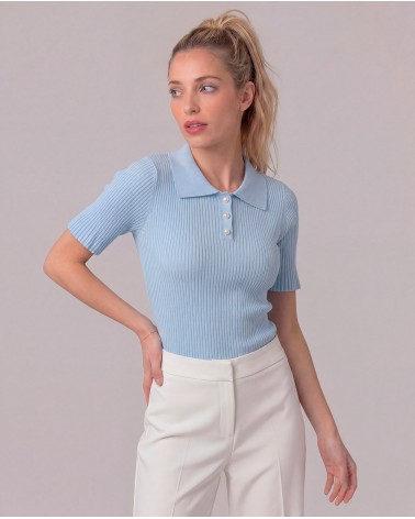 Polo a costine. Colletto a revers e maniche corte. Chiusura frontale con tre bottoni gioiello.