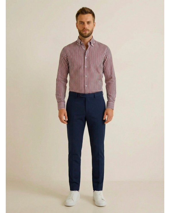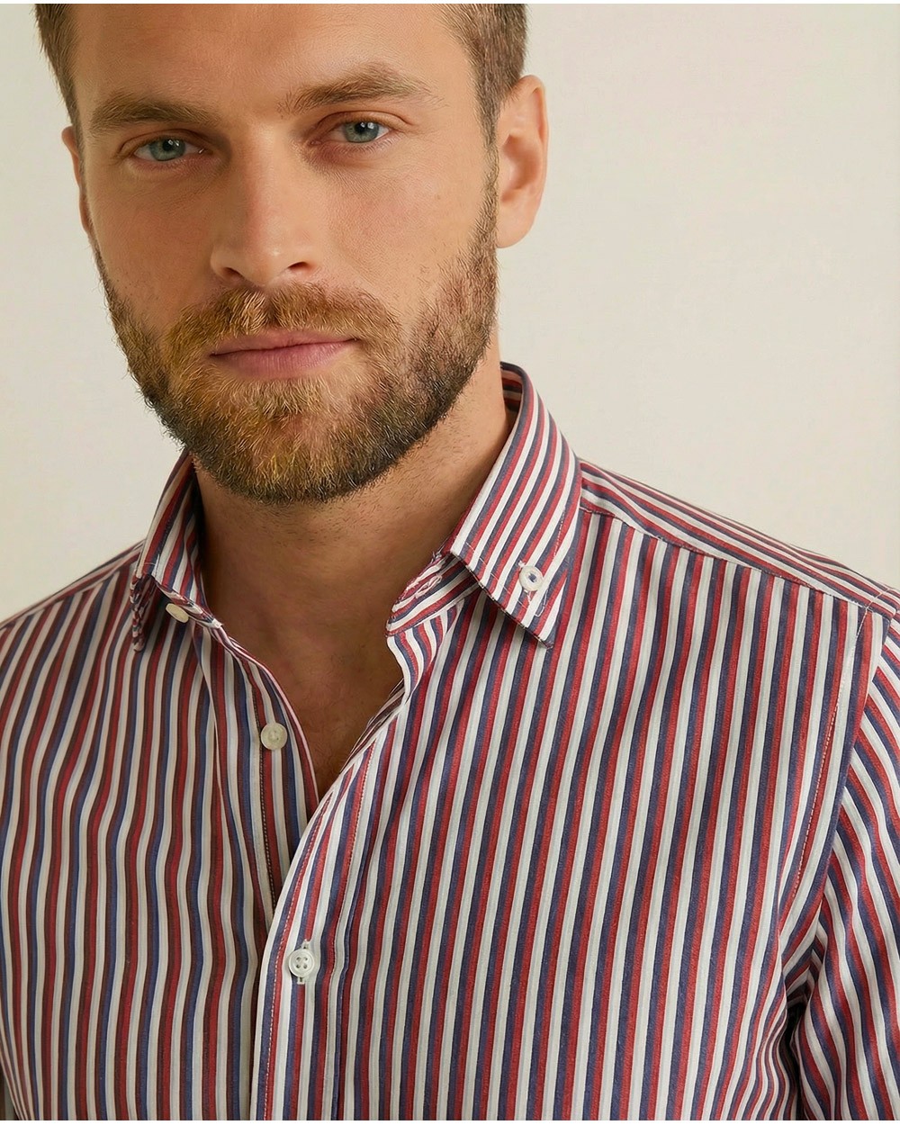 Camicia regular fit con struttura a righe. Colletto a revers con bottoni. Maniche lunghe con bottone sul polsino. Chiusura frontale con abbottonatura. Pinces sulla parte posteriore. Interno a contrasto nel colletto e nel polsino.