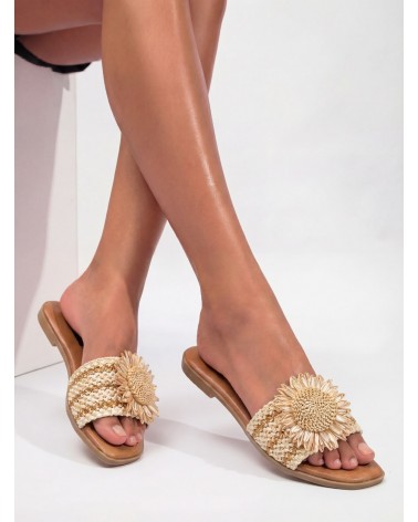Sandali bassi con fascia larga in iuta sulla parte anteriore e dettaglio di fiore. Modello a punta rotonda.