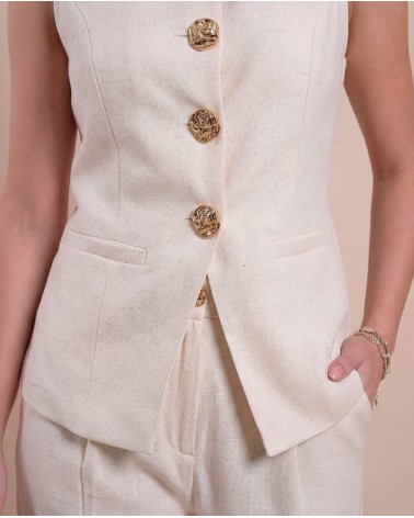 Gilet con collo rotondo. Chiusura frontale con bottoni gioiello. Finte tasche sul davanti.