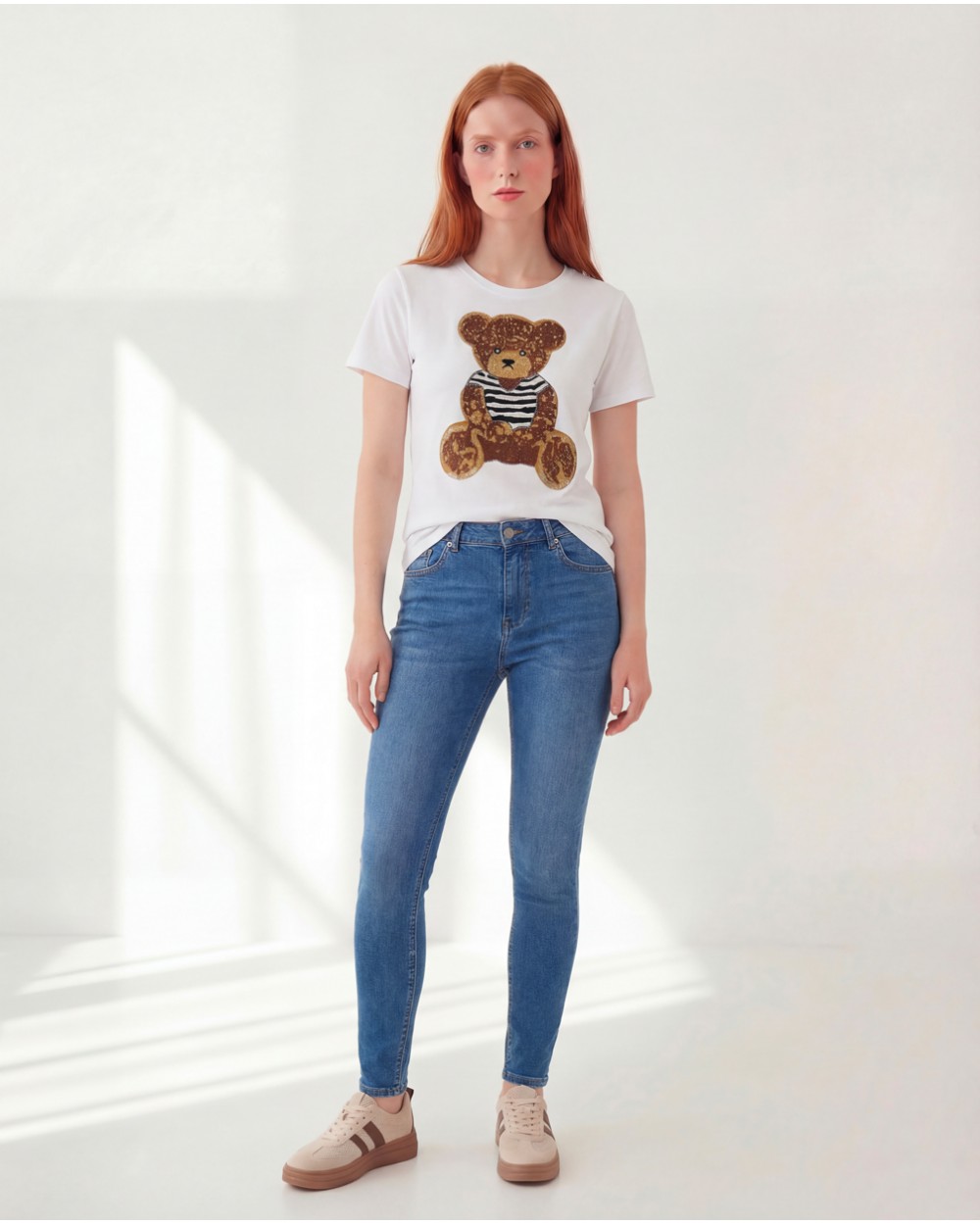 T-shirt con collo rotondo e maniche corte. Dettaglio di stampa sul davanti con applicazione di strass.