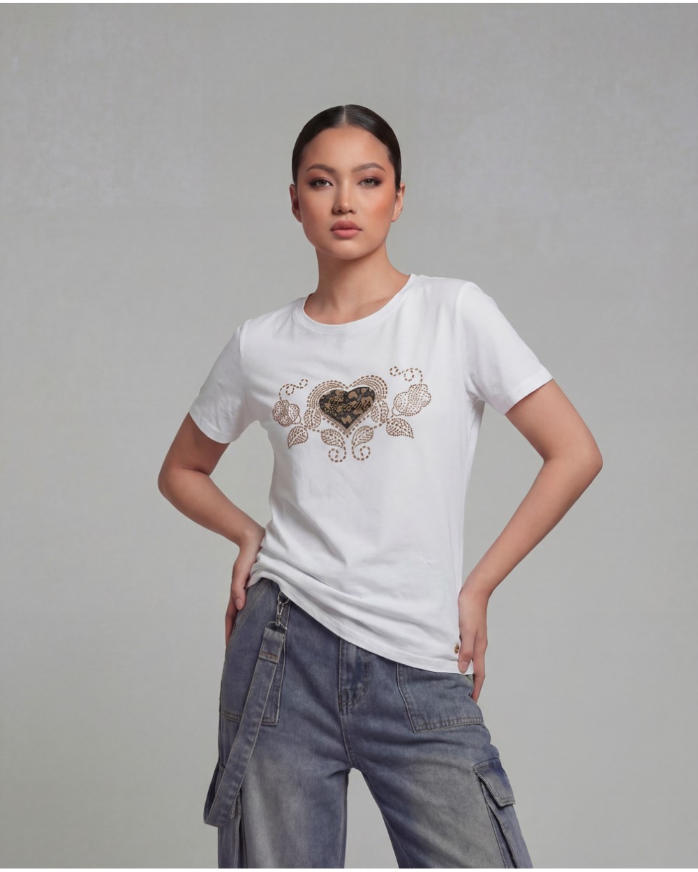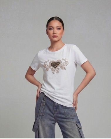 T-shirt con collo rotondo e maniche corte. Dettaglio di applicazione di strass.