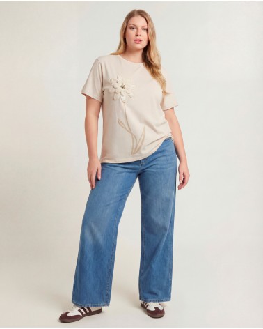 T-shirt oversize con collo rotondo e maniche corte. Dettaglio di ricamo a forma di fiore e applicazione di strass.
