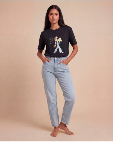 T-shirt con collo rotondo e maniche corte. Dettaglio di stampa con applicazione di ricami e strass.