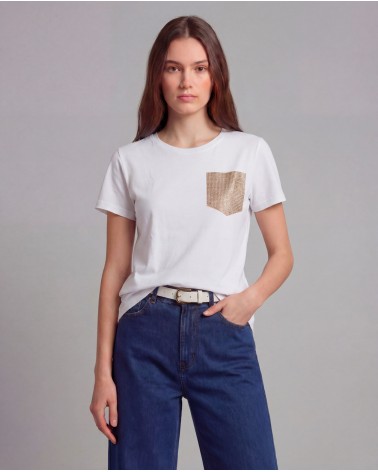 T-shirt con collo rotondo e maniche corte. Dettaglio di finto taschino con applicazione di strass.