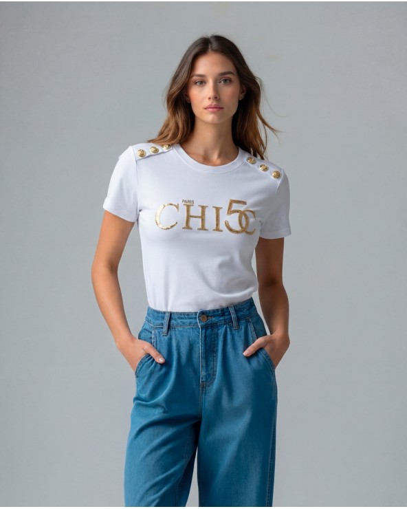 T-shirt con collo rotondo e maniche corte. Dettaglio di finti bottoni metallici applicazione di paillettes.
