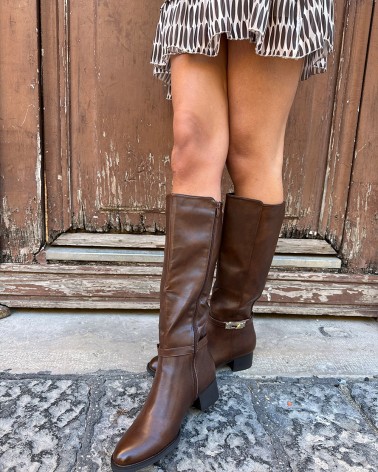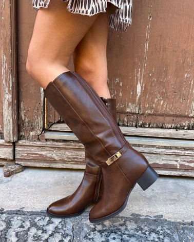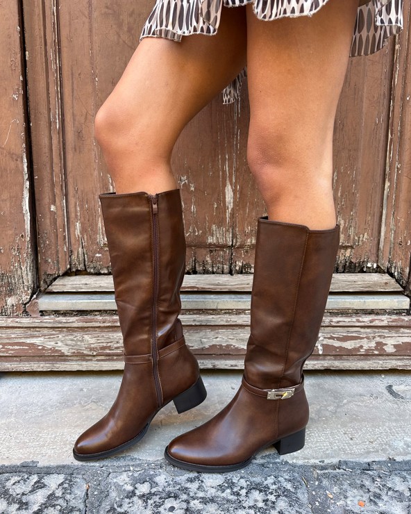 Stivale basso con gambale alto elasticizzato nella parte posteriore. Tomaia in ecopelle. Chiusura con cerniera laterale. Dettaglio di fascetta con fibbia metallica.