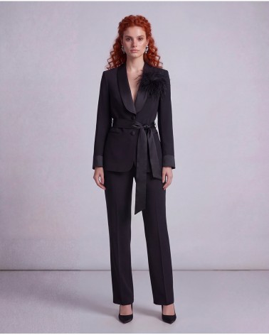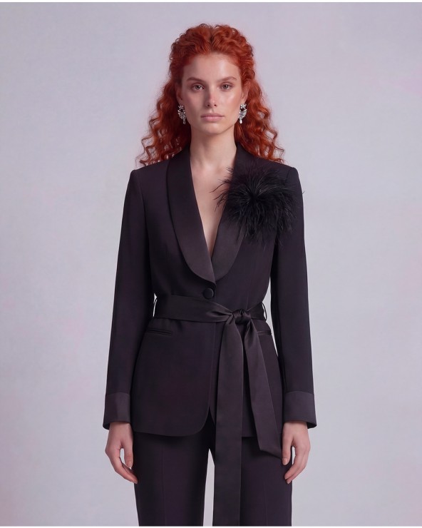 Giacca con colletto a revers e maniche lunghe velate con spalle segnate. Chiusura frontale con un bottone. Finte tasche anteriori. Dettaglio di cintura effetto raso. Spilla con piume removibile.