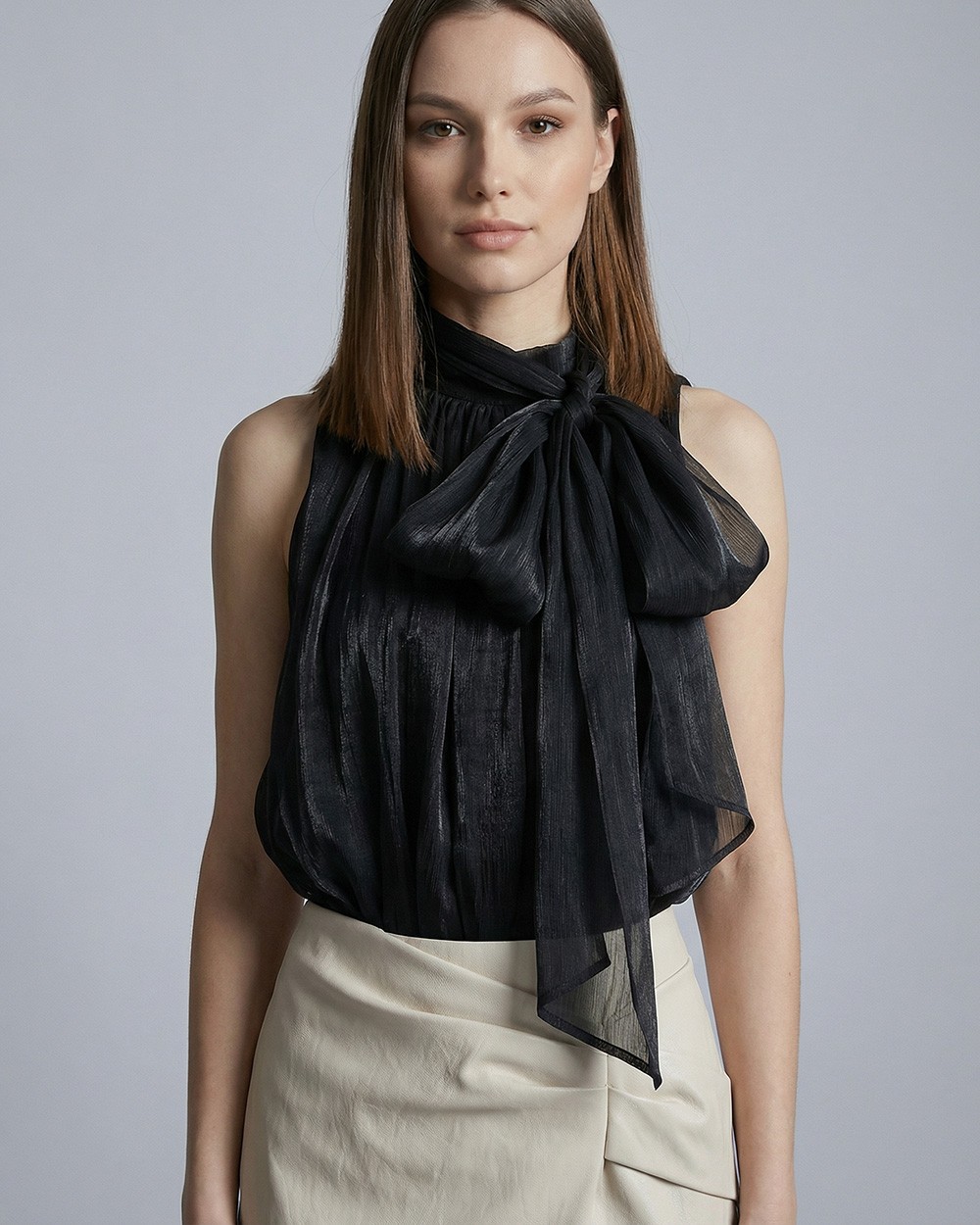 Body senza maniche con collo rotondo. Chiusura sulla parte inferiore con bottoni a pressione e sulla parte posteriore con cerniera a scomparsa. Presenta fodera interna. Dettaglio di fiocco sul davanti.