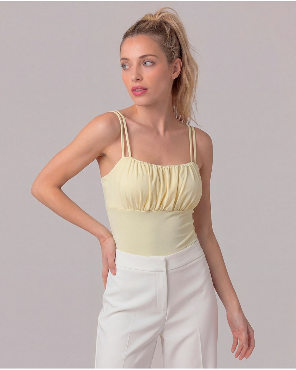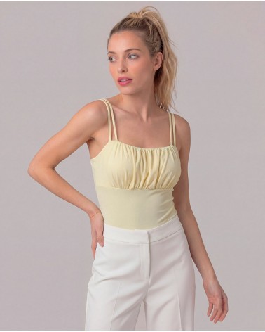 Top in tessuto elasticizzato con bretelle sottili. Coppe foderate. Orlo asimmetrico. Dettaglio di arricciature.