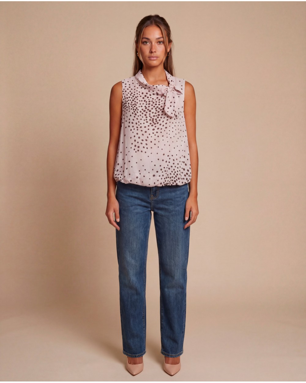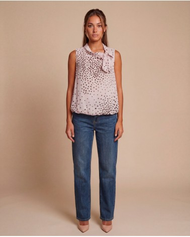 Top morbido a pois con collo rotondo. Dettaglio di fiocco. Orlo inferiore elasticizzato. Fodera interna.