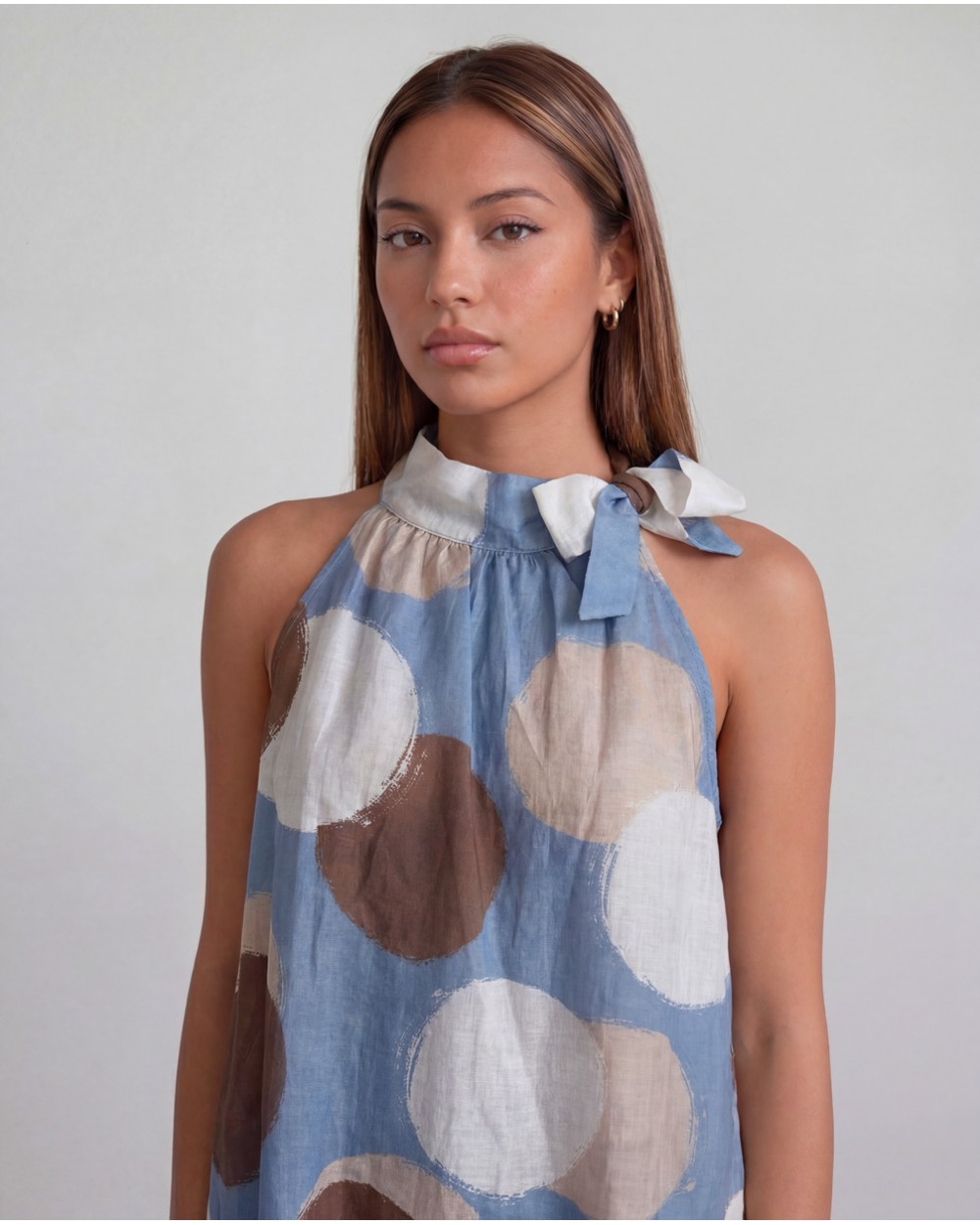 Top morbido a pois. Scollo halter e giromaniche. Dettaglio di nodo. Fodera interna.
